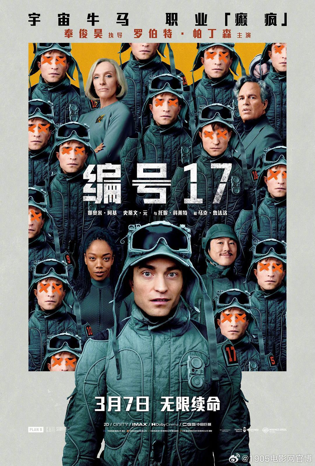 #1905观影团# 关注@1905电影网官博 转评赞此微博,随机抽送《编号17》电影兑换码!由奥斯卡最佳导演奉俊执导、罗伯特·帕丁森、史蒂文·元、马克·鲁法洛等主演的电影《编号17》讲述了米奇·巴恩斯(罗伯特·帕丁森 饰)在地球一事无成,无奈下加入星际殖民计划,任职“消耗体”,从此开启了可以反复去世又不断重生、高危工作繁多望不到头的“宇宙牛马”死去活来打工记。某次,第17号米奇从又一危险任务死里逃生,回家后却发现自己已经被米奇18号取代了位置,一场啼笑皆非的科幻冒险黑色喜剧就此上演。