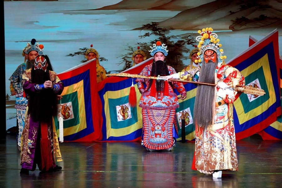 中华有神功,戏里有乾坤。婺剧得名于金华的古称婺州,表演夸张、生动、形象、强烈,亮相功架别具一格、特技表演传承颇多,由李烜宇、刘福明主演,浙江婺剧艺术研究院倾情助演的婺剧《浩气春秋》选段旗帜飘飘、声势夺人。