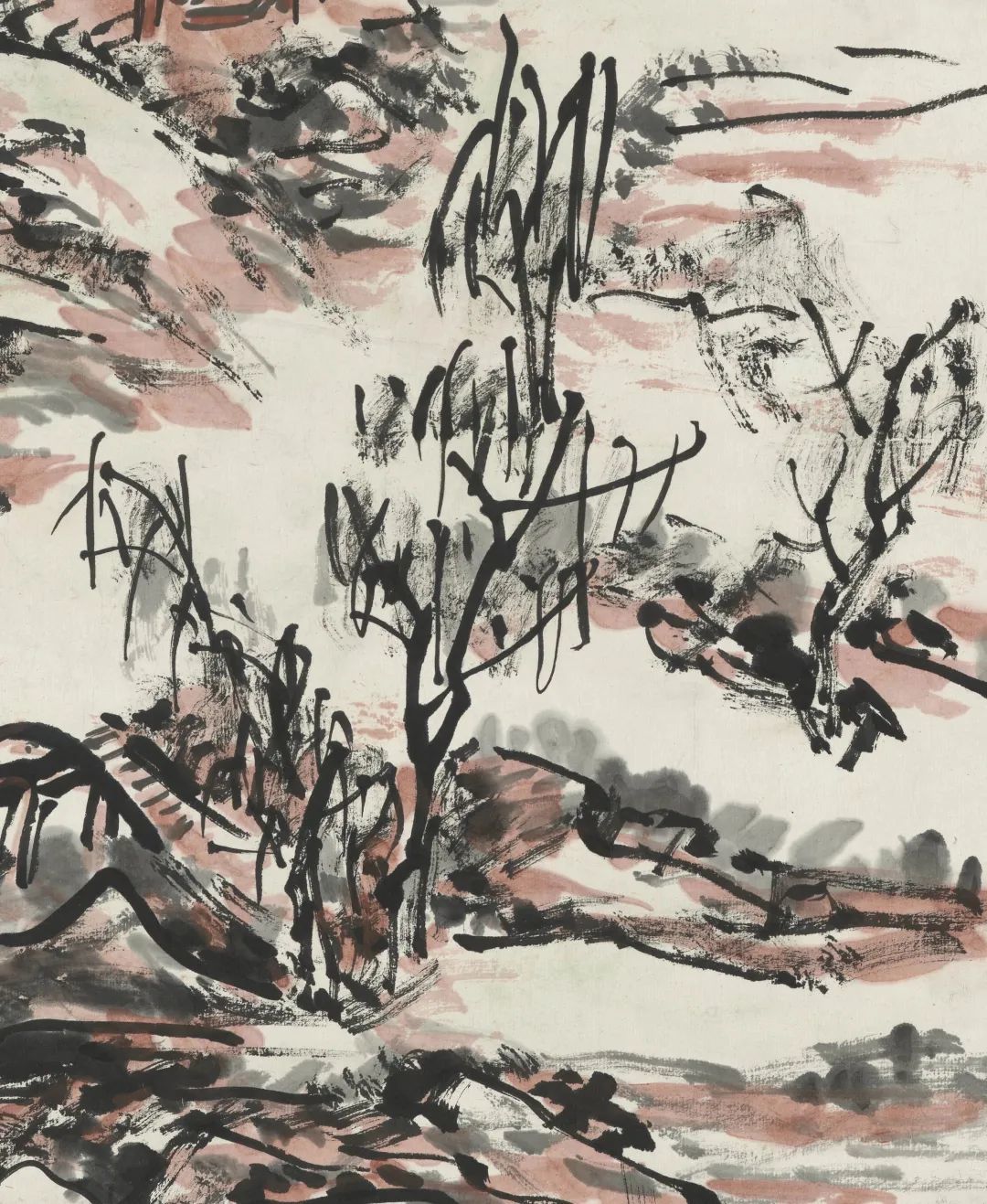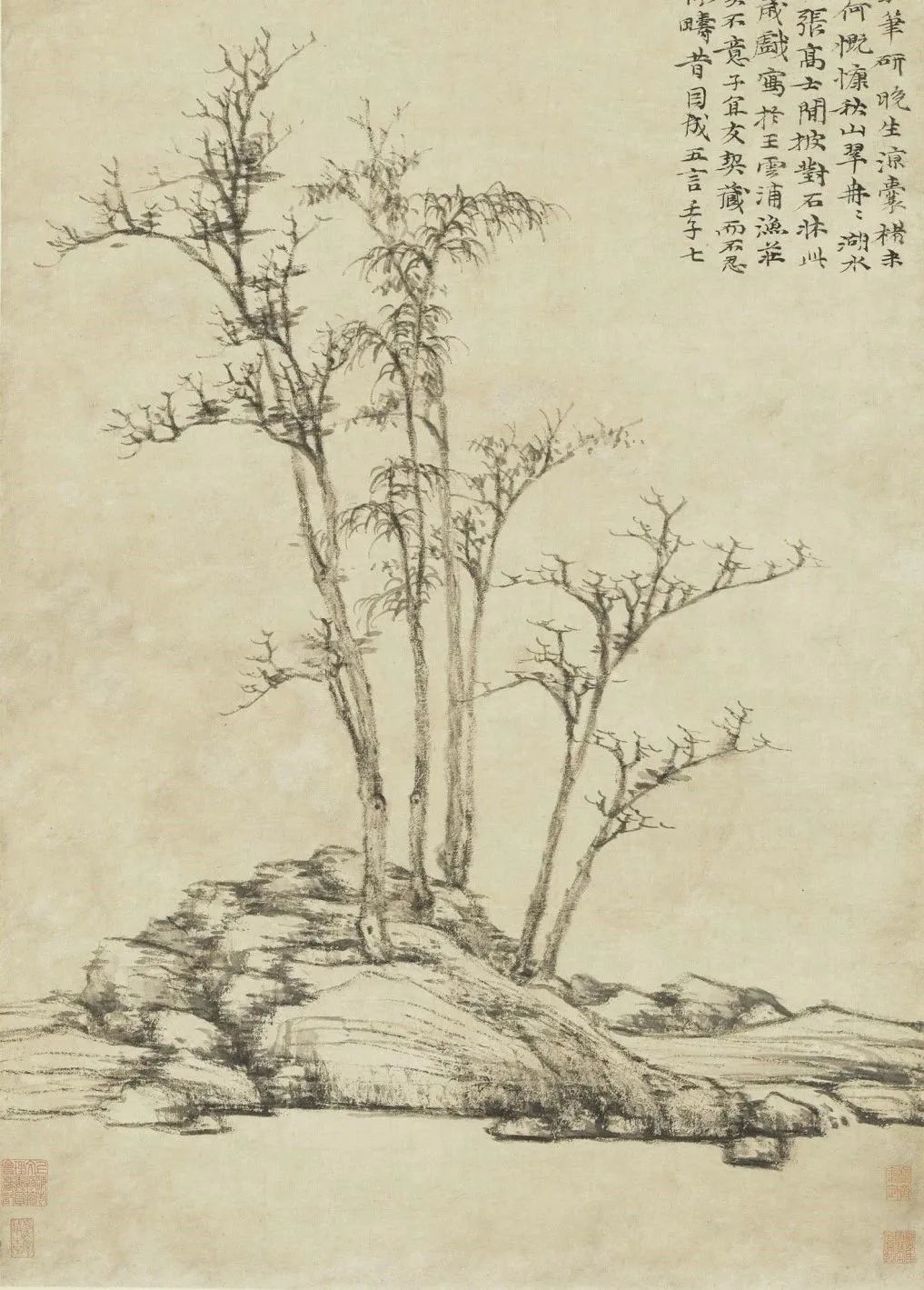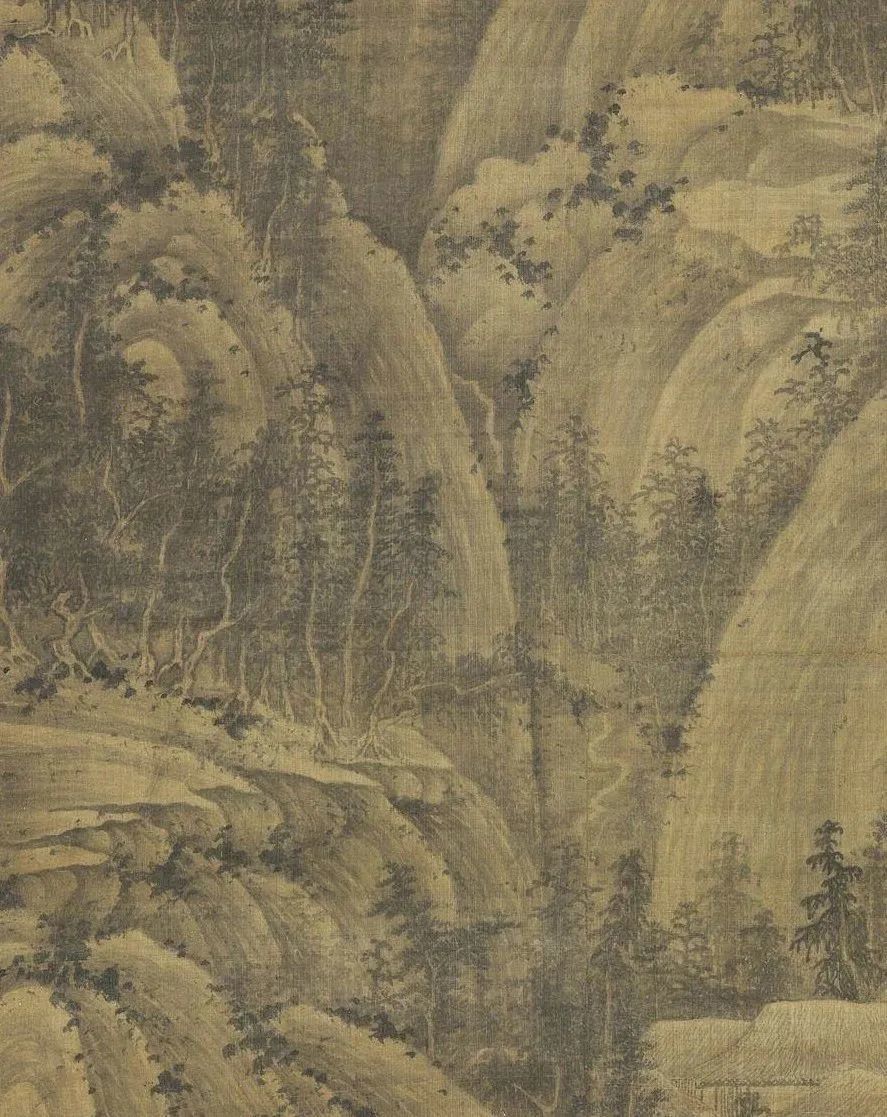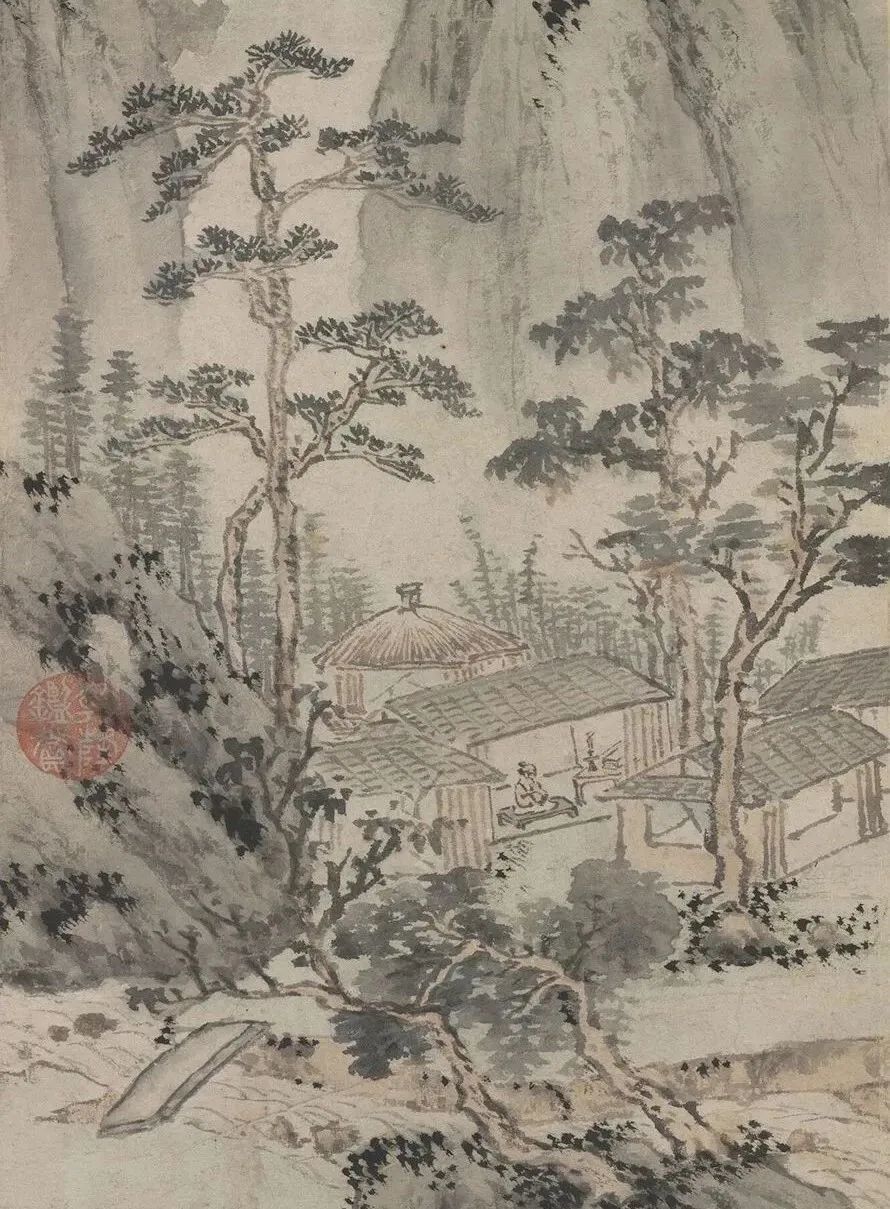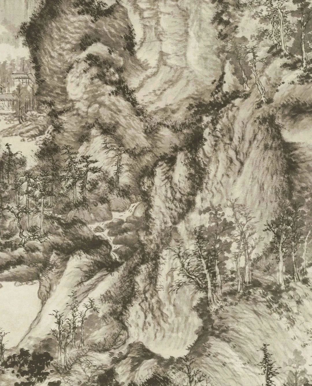 巨然点苔,如雨滴石坠,惊心动魄,好似数百年饱经风霜的灌木丛草,扎根岩缝石罅,纹丝拔动不得,墨彩四溢。