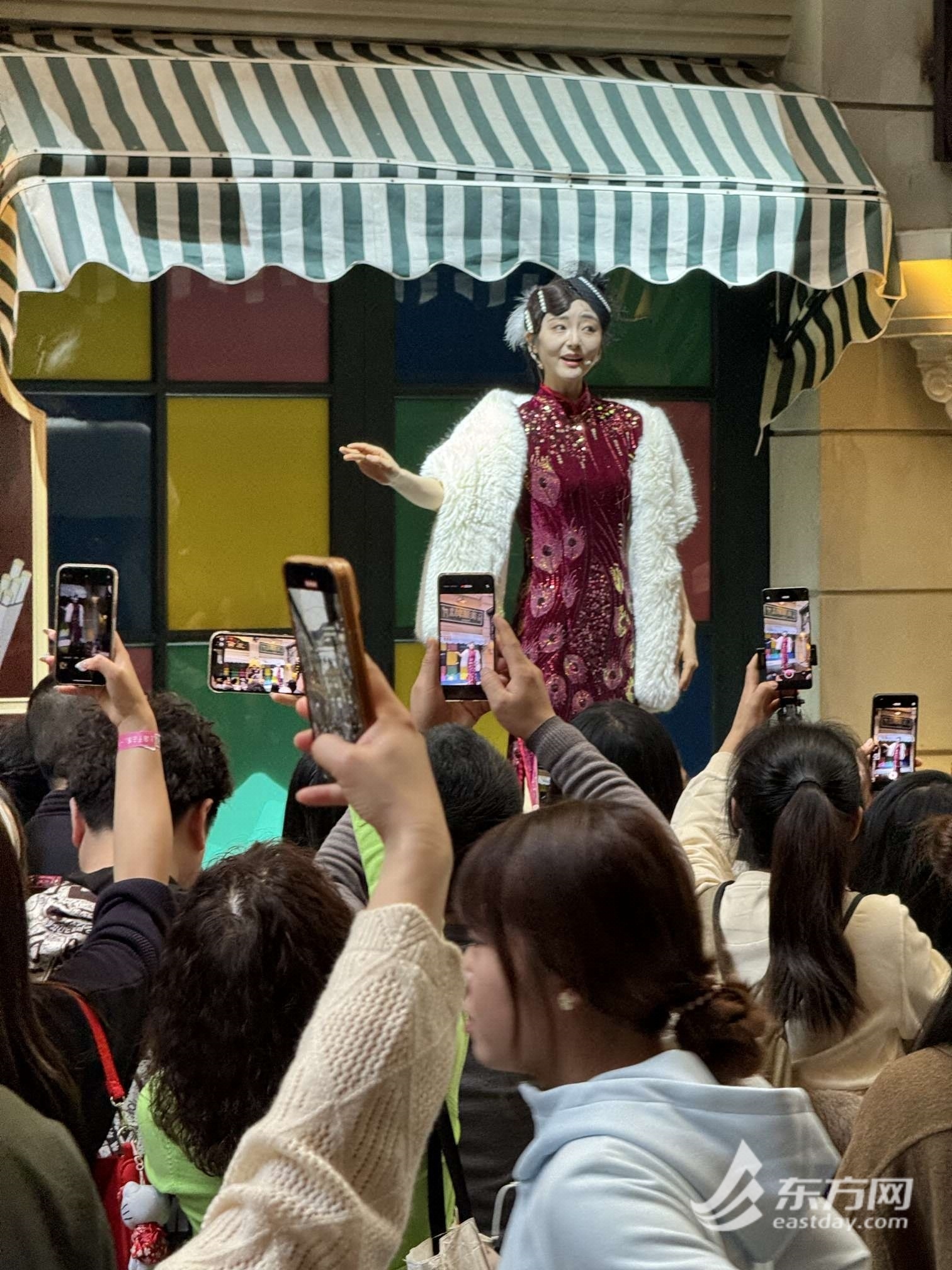 走进穿越街,正上演“上海阿姨”和“斧头帮”的世纪舞蹈Battle;络腮胡“许文强”突然狂飙沪式英语;《穿越音乐会》上,英文版《声声慢》流淌着沪式海派风情;烫波浪卷的“旗袍店主”拽住路人:“我们店今天上新呀,老板!”当“书桓”与“依萍”在人群中上演“寻爱”戏码时,游客的即兴反应直接触发剧情——两人终于相拥。
