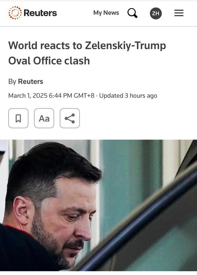 路透社3月1日电:乌克兰总统泽连斯基和美国总统特朗普在周五以灾难告终的白宫会议上发生冲突,引发了全球各地的强烈反应。