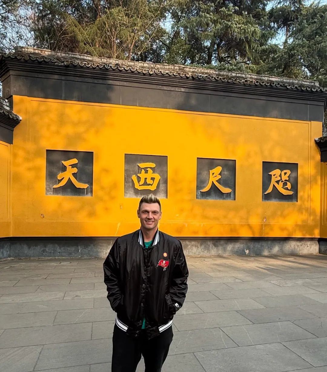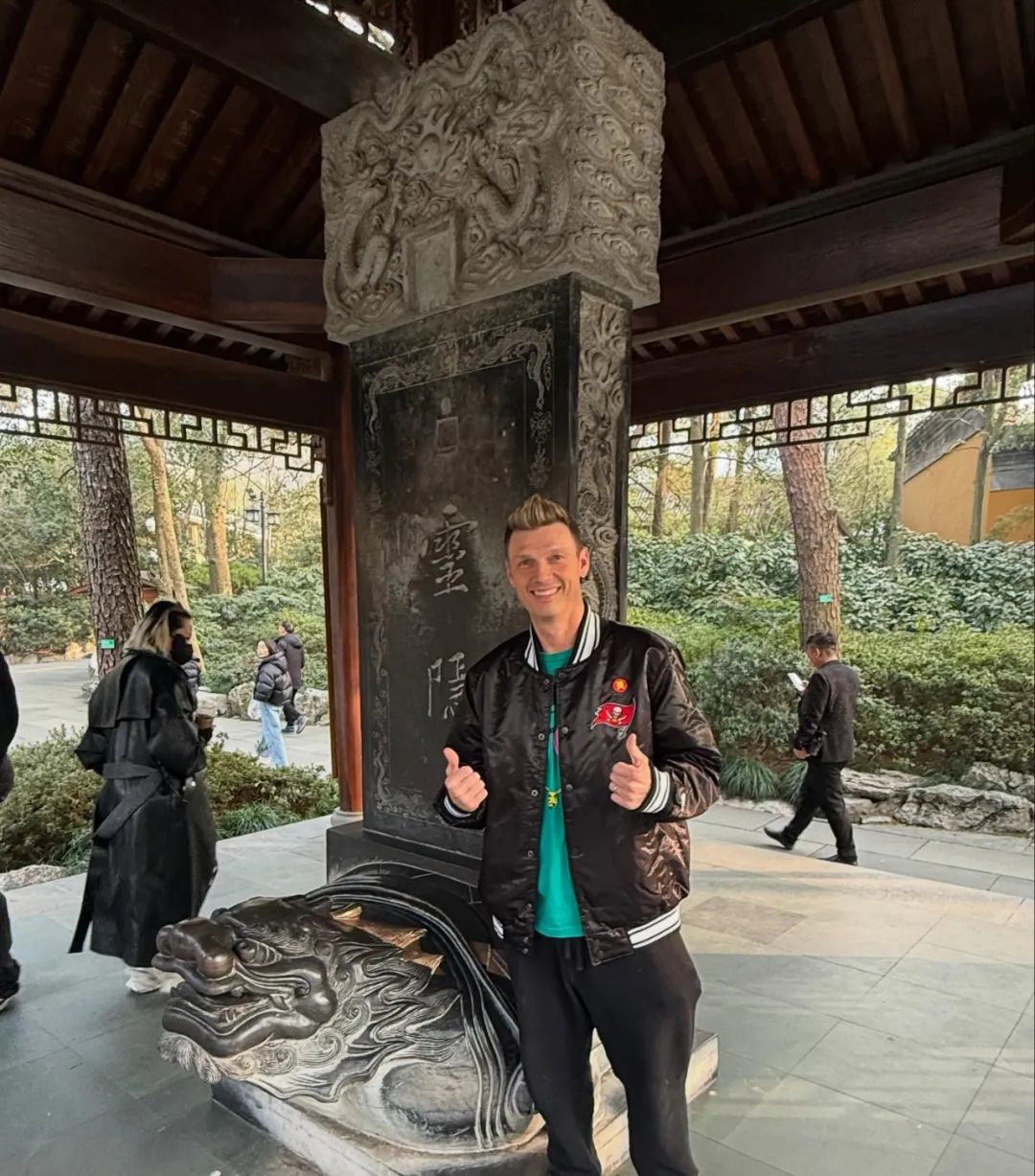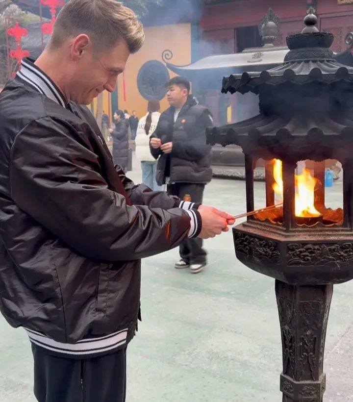 前几天抵达杭州的Nick Carter,特意前往历史悠久的灵隐寺烧香祈福。