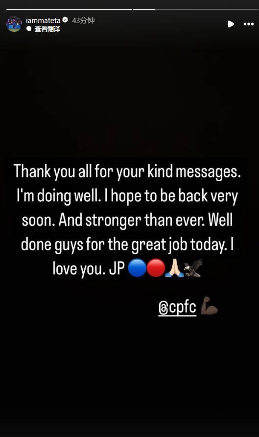 在今天晚上进行的足总杯八分之一决赛中,水晶宫主场3-1击败米尔沃尔,其中马特塔在第8分钟遭到米尔沃尔门将利亚姆-罗伯茨飞踹,之后被换下场,赛后,他在社交媒体上发表动态,向球迷报平安。