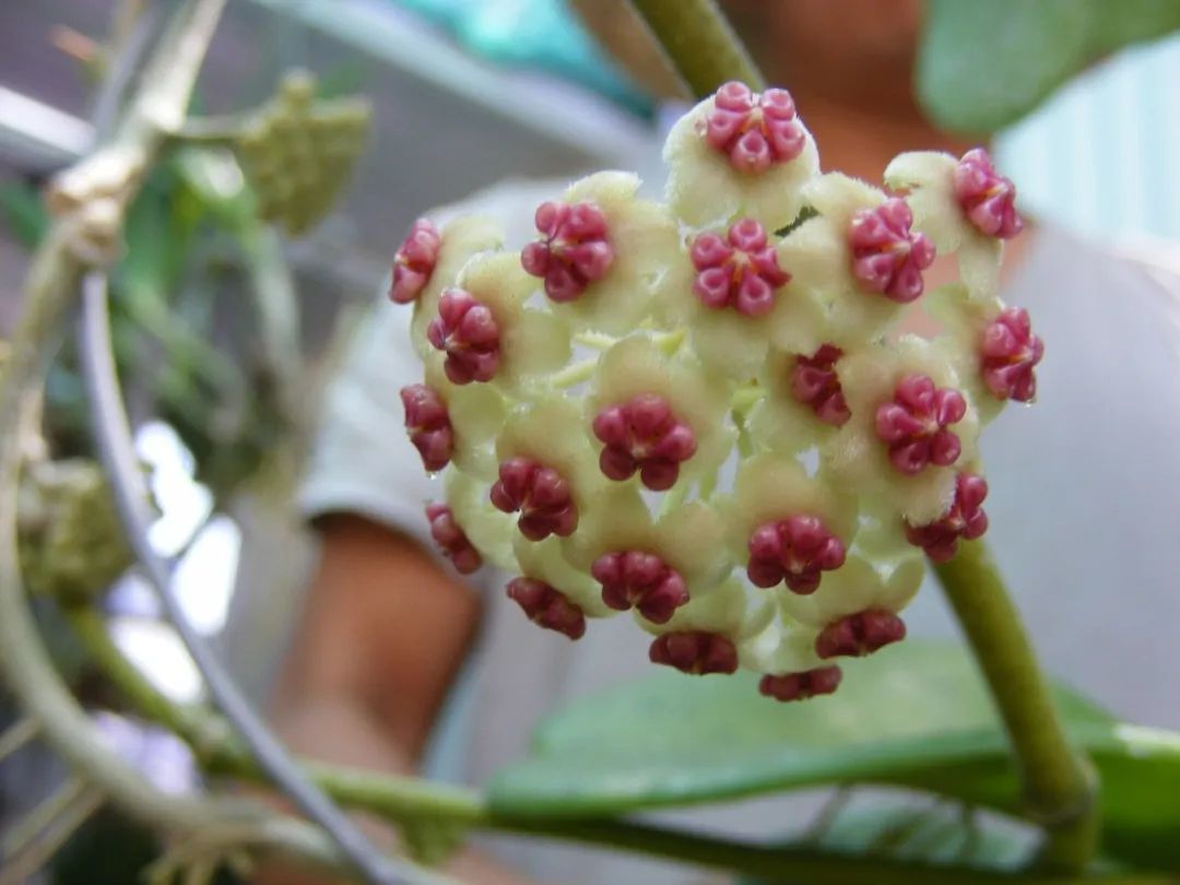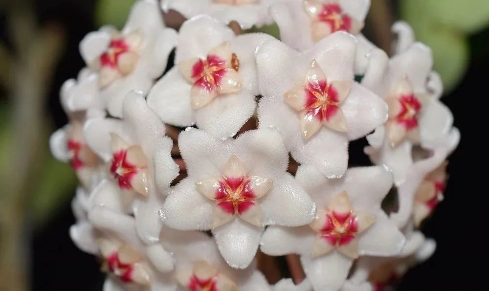 不同的球兰品种开花时间也是不一样的,一般是在春夏秋三季孕育花朵,它的花朵是开在花梗上的,花梗的位置一般是在枝条的中上部。