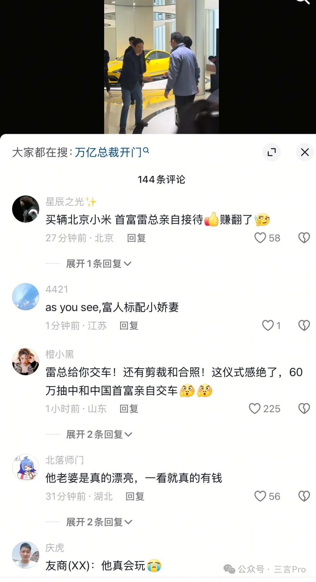 网友对此评价:“买辆北京小米,雷总亲自接待,赚翻了”,“雷总给你交车,还有剪裁和合影,这仪式感绝了,60万抽中和首富亲自交车”。