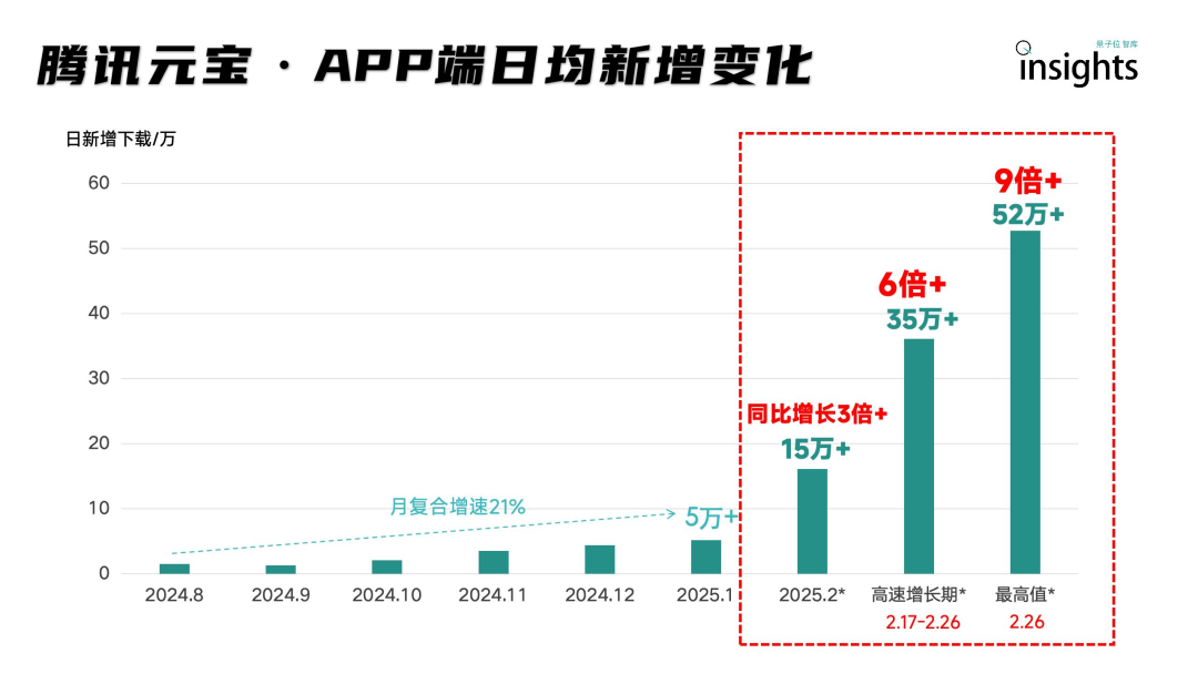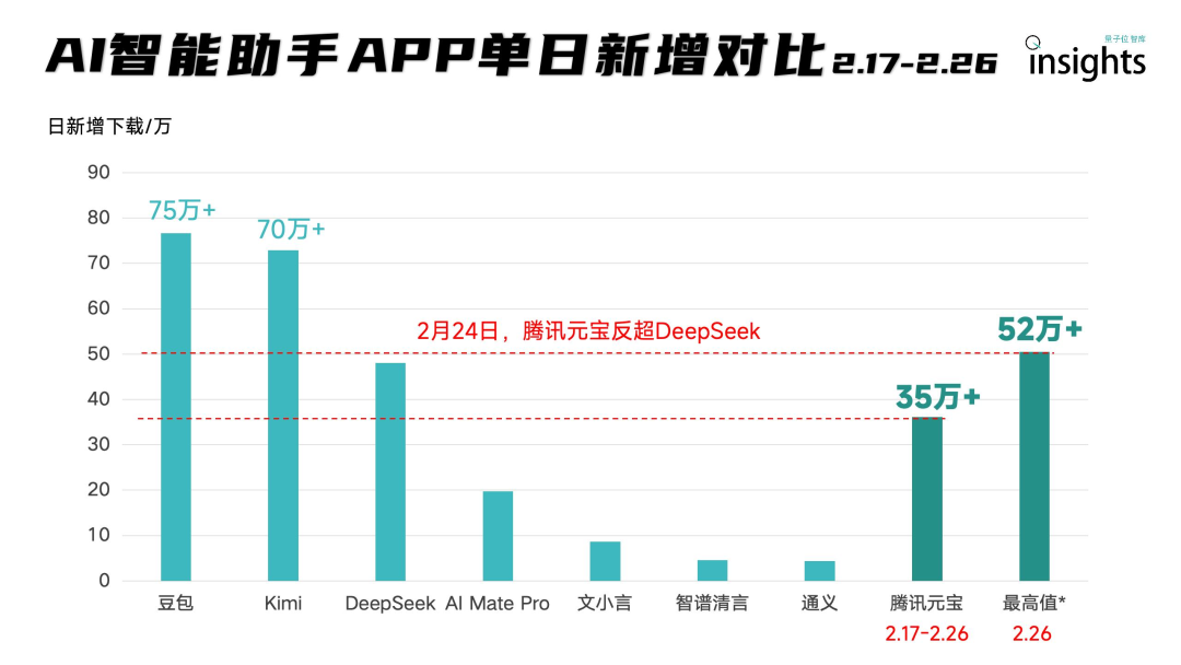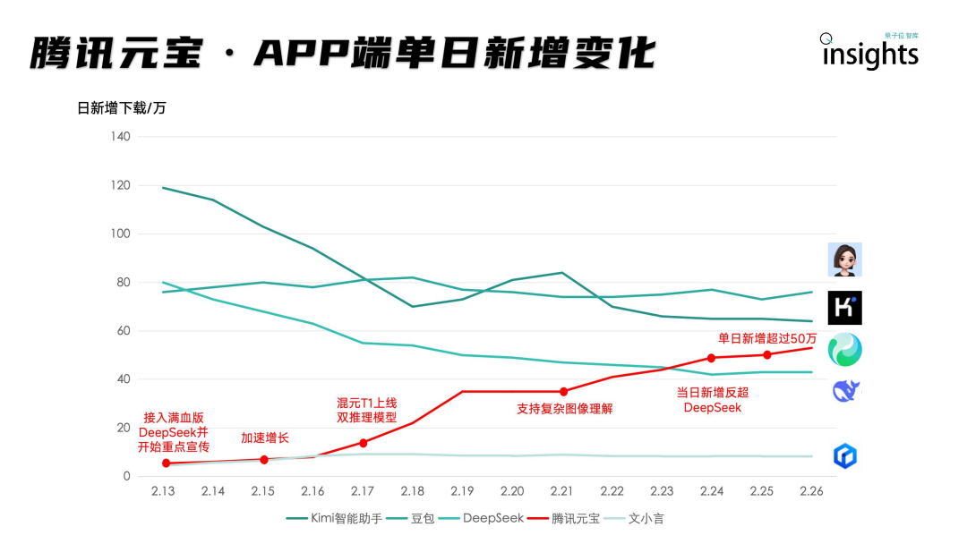 用户规模及增长方面,在官宣接入DeepSeek仅5天后,元宝的单日下载就翻倍增长至10万,并在2月25日单日下载突破50万。