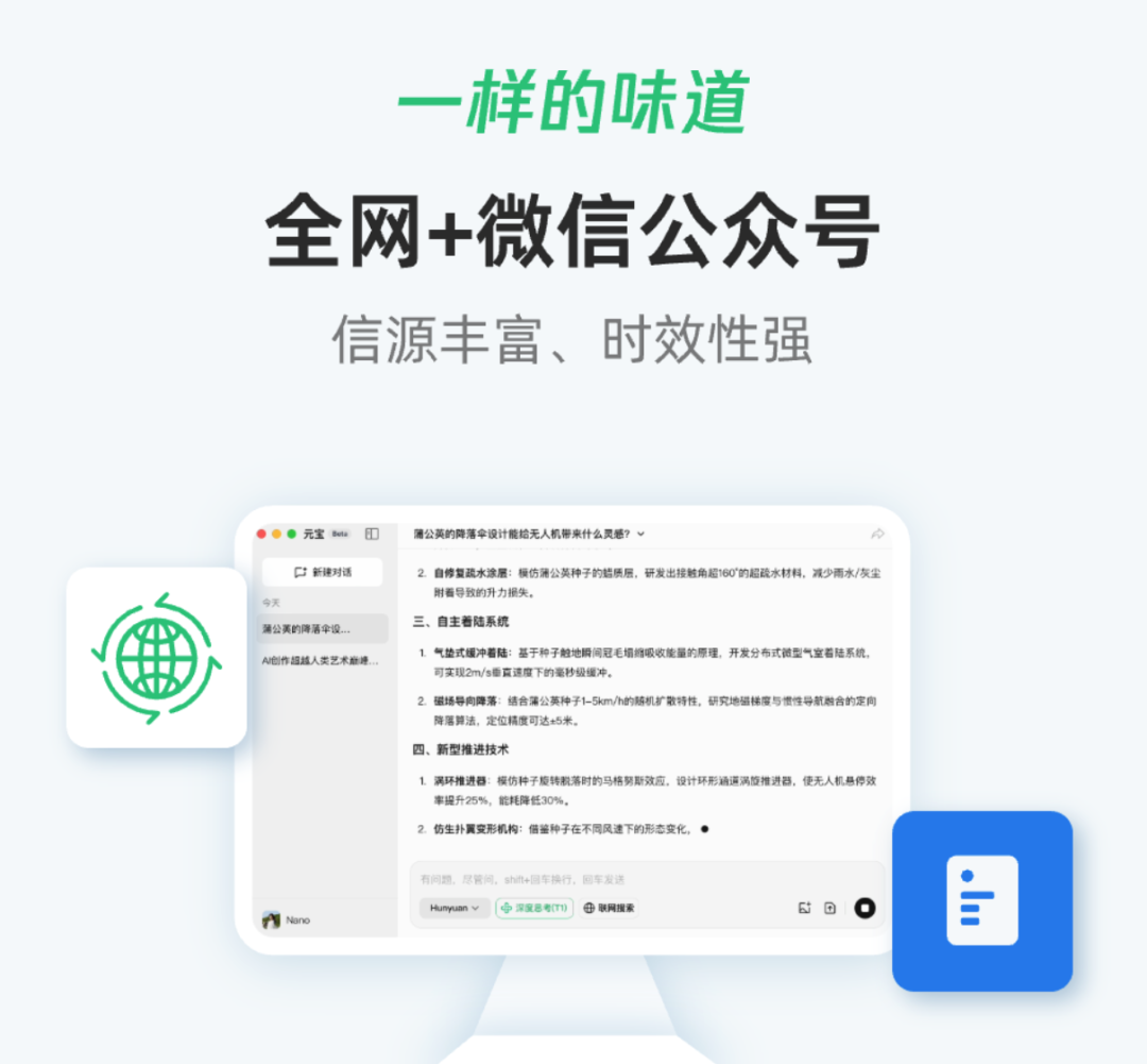 从官方介绍的功能特点来看,区别于其它大模型产品,微信公众号这个资源渠道成了元宝电脑版的一大特点。