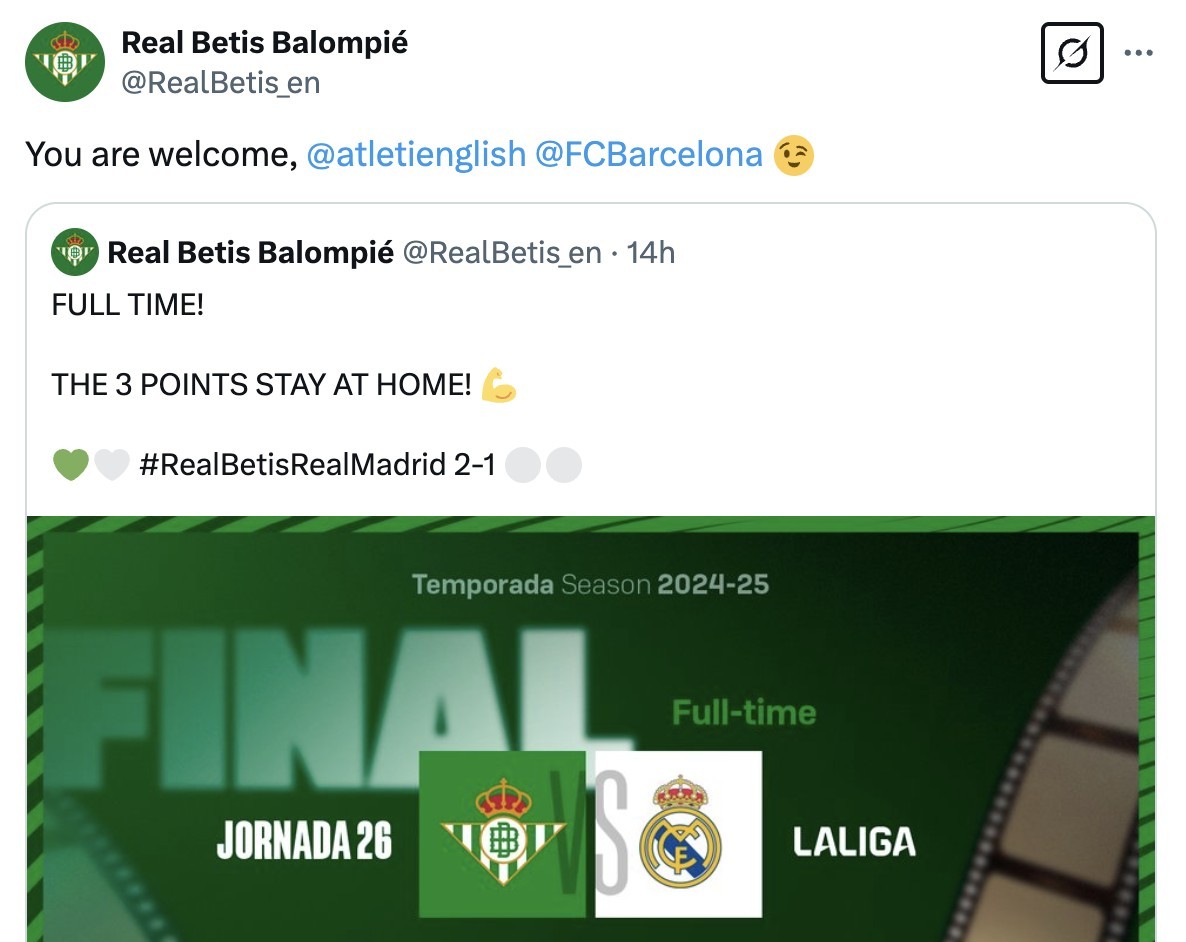 比赛结束之后,皇家贝蒂斯英语官方社交平台发文写道:“巴塞罗那和马德里竞技,不客气。”