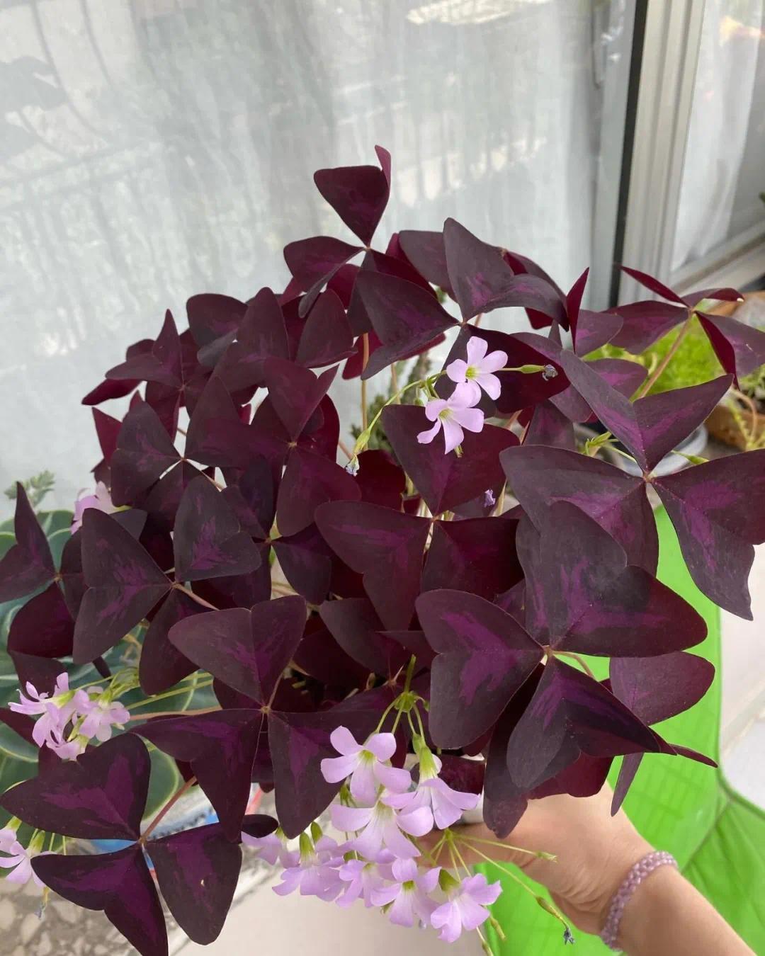 养护紫叶酢浆草非常简单,就是等盆土差不多干透,盆土拿起来比较轻了,再给它浇水。如果我不知道怎么判断,就可以用手指把表层土弄开,土壤下三厘米左右都很干了,那就要浇透水了。