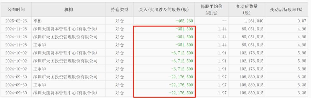 如今天图资本这位奈雪的茶“贵人”也对其长期亏损用脚投票,不断减持套现。公开信息显示,2023年1月、2024年7月、9月、10月和11月,天图资本多次减持,第一次减持2093.2481万股,套现1.46亿港元,第二次套现73.72万港元,第三次套现7359万港元,2024年10月后减持700多万股,累计套现约2.3亿港元。持股比例由11.09%骤减为4.98%。