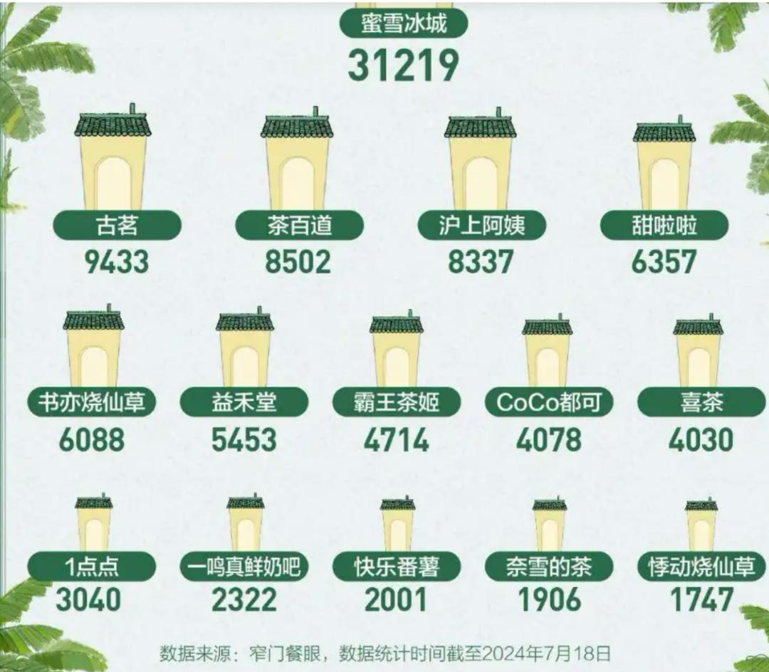茶饮市场的规模体量没有爆发式增长,而奈雪的茶竞争对手却日益增多,除了以前喜茶、乐茶茶等老对手之外,茶百道、霸王茶姬、古茗以及在低端市场无敌的蜜雪冰城都成了奈雪的茶的新对手,在生存空间受到严重挤压的情况下,奈雪的茶门店扩张速度明显不如竞争对手。截至2024年7月18日,奈雪的茶拥有门店1906家,在国内门店数量前15的茶饮品牌中倒数第二。