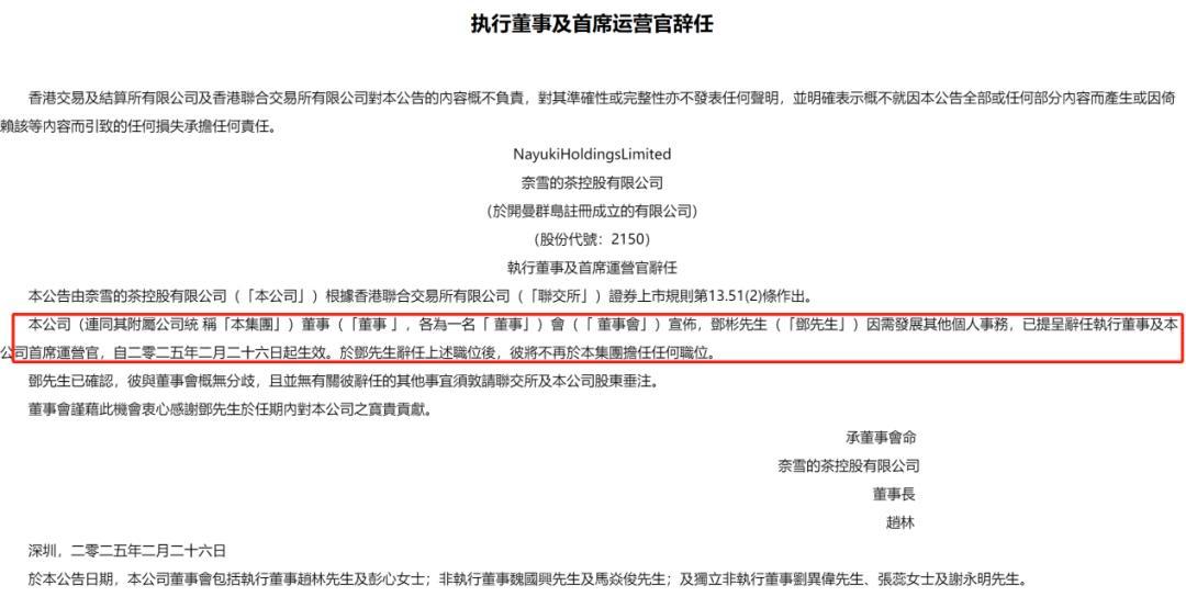 2月26日,茶饮第一股奈雪的茶发布公司重大人事变动公告,公告称公司执行董事兼首席运营官邓彬离职,离职原因是“因需发展其他个人事务”,且自公告之日起生效。公告还强调邓彬辞任上述职位后,彼将不再担任奈雪的茶任何职位。