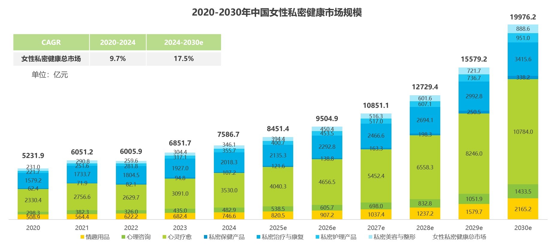 市场规模口径注释:1、私密美容与整形:女性针对私处进行手术、注射玻尿酸、光电治疗等项目;2、私密护理产品:私密洗液、凝胶、精油、喷雾等产品;3、私密保健产品:女性益生菌等保健类产品;4、心灵疗愈:按摩、瑜伽、音乐疗法、芳香疗法等产品和服务;5、心理咨询:线上、线下等心理咨询项目;6、情趣用品:情趣内衣、玩具、避孕套等产品。