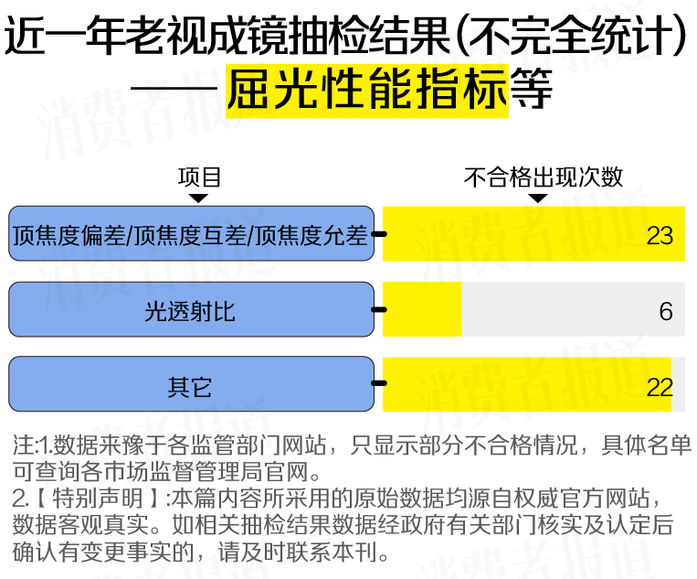 顶焦度的相关指标均属于屈光性能指标,是确保镜片能够正确矫正视力的关键参数。抽检数据显示,在这些项目上不合格的产品有23批次,有不少产品甚至同时涉及光学中心、顶焦度等多个指标不合格。
