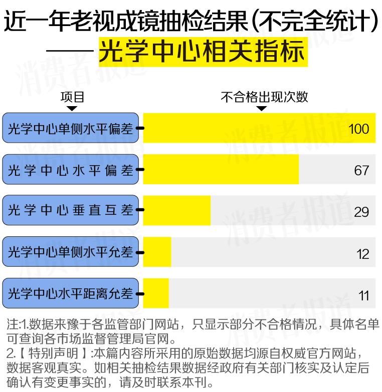 抽检数据显示,不合格产品涉及最多的项目为光学中心单侧水平偏差,达100批次,其次是光学中心水平偏差,有67批次。
