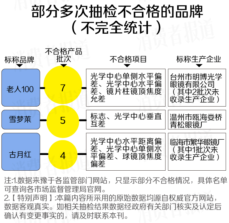抽检数据显示,有部分品牌多次抽检不合格,例如标称生产企业为台州市明博光学眼镜有限公司出品的“老人100”老花镜,涉及光学中心单侧水平偏差、光学中心水平偏差等多个项目不合格。雪梦莱、古月红等品牌也多次抽检不合格。