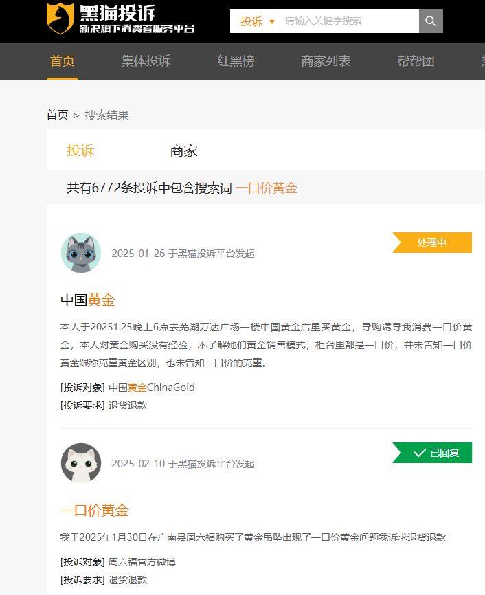 记者发现,类似的“一口价”黄金投诉在投诉平台上并不鲜见,是黄金产品投诉的重灾区。