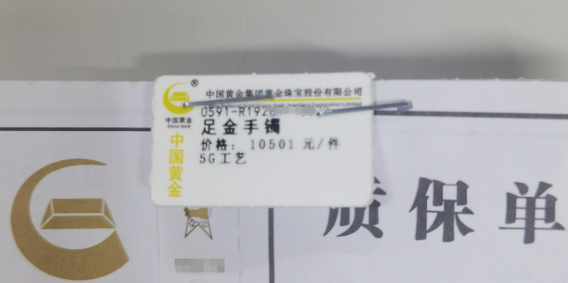▲该足金手镯按件计价,克重标签被钉在最下方,较难发现