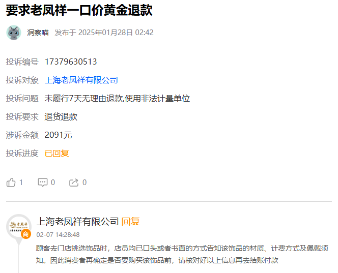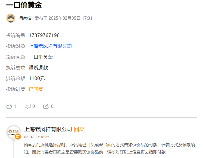 李小姐在投诉平台发布投诉之后,上海老凤祥有限公司这样回复她:顾客去门店挑选饰品时,店员均以口头或者书面的方式告知该饰品的材质、计费方式及佩戴须知。因此消费者在确定是否要购买该饰品前,请核对好以上信息再去结账付款。
