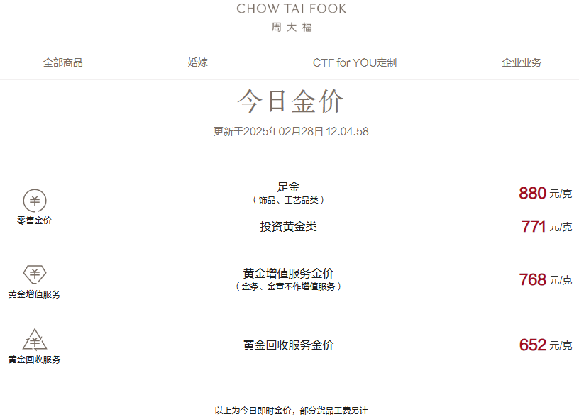 值得注意的是,购买以克计价的黄金饰品时,各家品牌门店的当日金价并不完全一致,且随时间而变动。例如2月28日,中国黄金的当日金价为857元/克,而周大福、六福珠宝的当日金价为880元/克。部分品牌门店的销售人员还告诉记者,算上折扣和工价,以克计价的黄金饰品可低至850元/克。整体算下来,以克计价的黄金饰品克价显然比“一口价”黄金饰品实惠不少。