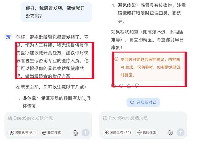 小编尝试在DeepSeek询问关于感冒发烧处方的问题,得到的回复中也多次强调“人工智能无法提供具体的医疗建议或开具处方”“内容由AI生成,仅供参考,如有需求请及时就医“等提醒警示的内容。