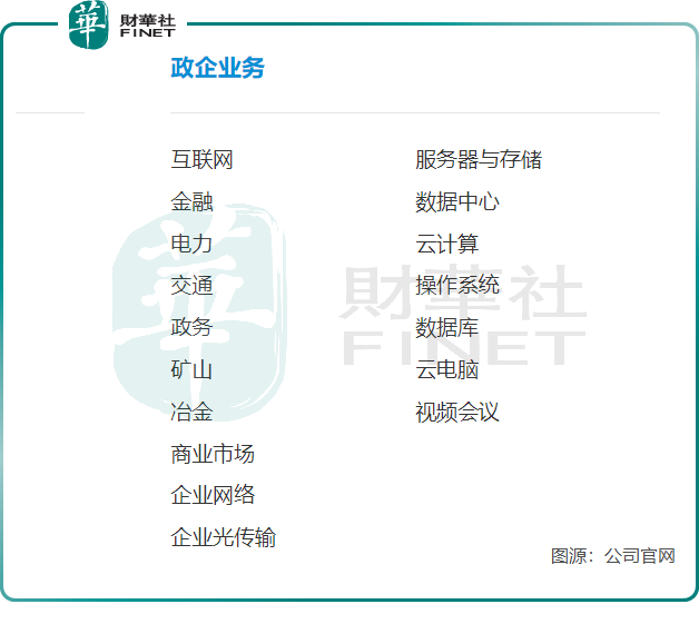 中兴通讯的政企业务主要基于通讯网络、物联网、大数据、云计算等产品,为政府和企业提供各类信息化解决方案,覆盖互联网、数据中心、云计算、金融、电力、交通、数据库等多个行业。