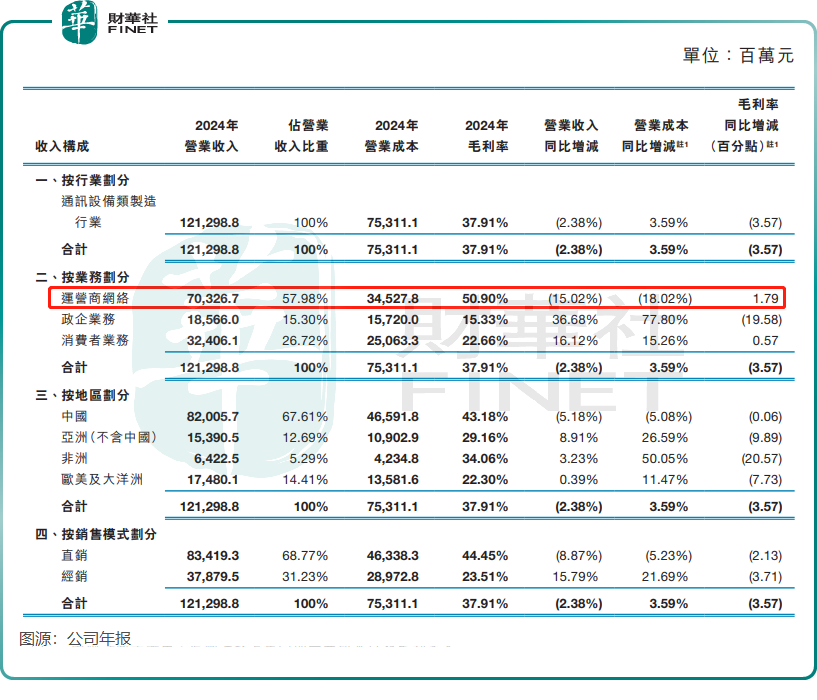 2024年,运营商网络收入比重虽然下降至57.98%,但仍是中兴通讯最主要的营收入来源。