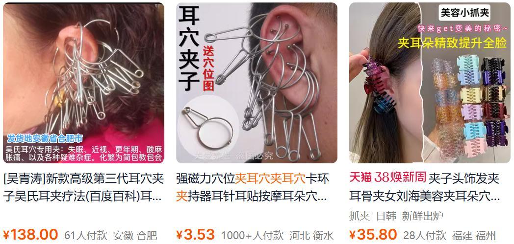 简易版耳穴贴也出现了,简易在根本不用贴。在电商平台上随便搜,能搜出很多“耳穴夹”,直接用夹的方式刺激耳穴,不用找丸状物也不用找胶布,简直都不用找穴位——你就用那3元5个的塑料小抓夹,一个夹子下去少说夹中4个穴位。