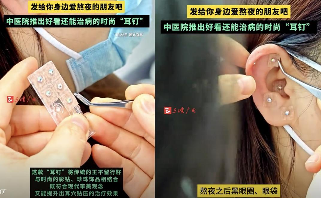其实提升耳穴贴装饰性的尝试也是一直都有的。2024年初,湖北省宜昌市中医医院和襄阳市中医医院都推出了时尚版耳穴贴,给王不留行籽裹上不同颜色的亮片闪粉,胶布改成透明的,和日本现下流行的耳穴首饰基本就是一回事。