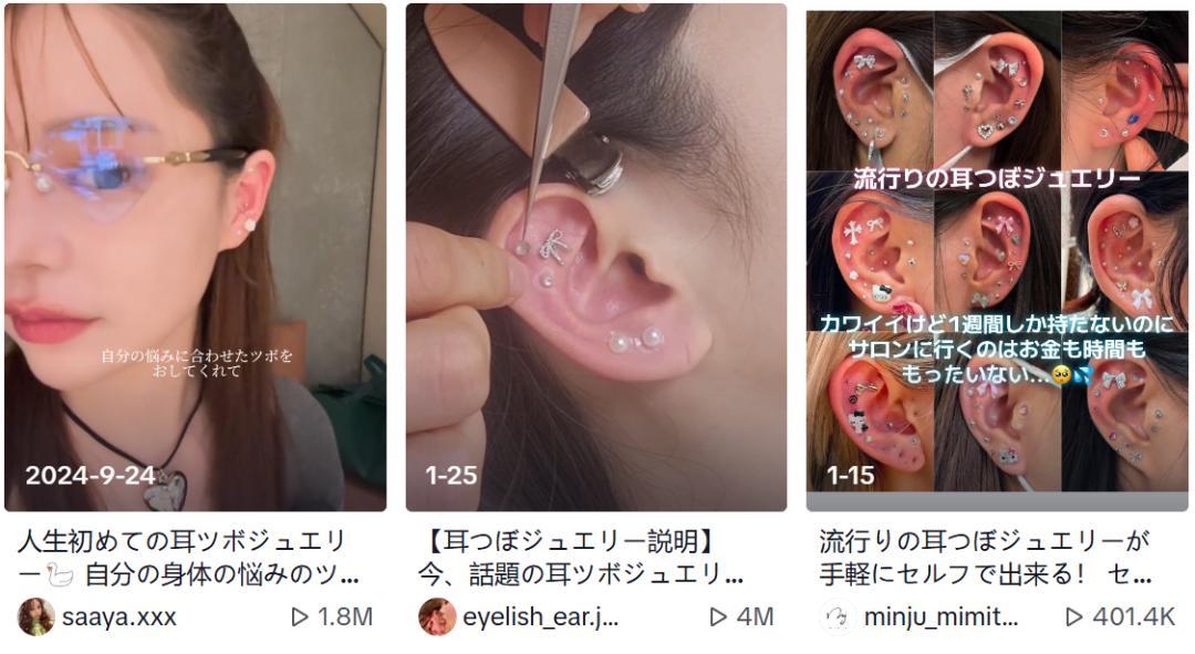 耳穴首饰这会儿在日本俨然已是2025年度最热门饰品趋势。TikTok上的相关视频浏览量动辄破百万,各个时尚媒体赶着趟儿写介绍文章,标题常用“话题沸腾”之类夸张的修饰词以示不容错过。