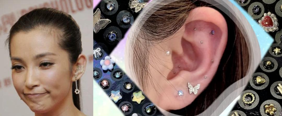 乍一看你以为是哪个Y2K系偶像掀起的原宿风回潮,在耳朵的每个犄角旮旯里都贴上钻,这个缝里贴个小蝴蝶,那个缝里镶颗小爱心,美甲店见过的珍珠水钻大亮片,这回全给耳朵招呼上了,誓要把耳朵挂成圣诞树;
