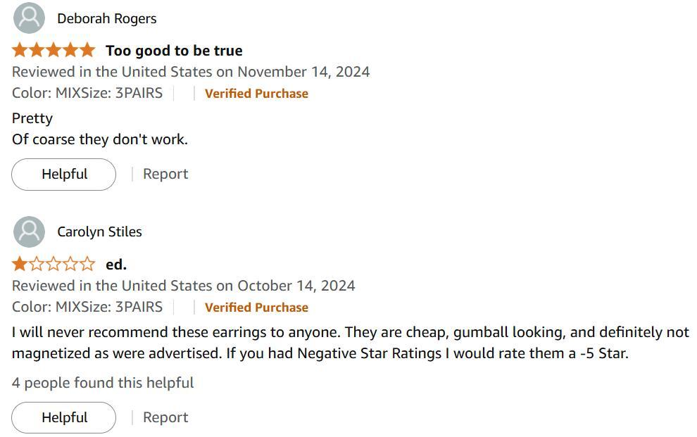 真的这么神奇吗?评价区给出了非常实诚的回应,一个五星好评已然看开:“漂亮,但当然没用”,一个一星差评仍在恼怒:“如果能给负分我会给负五星”。