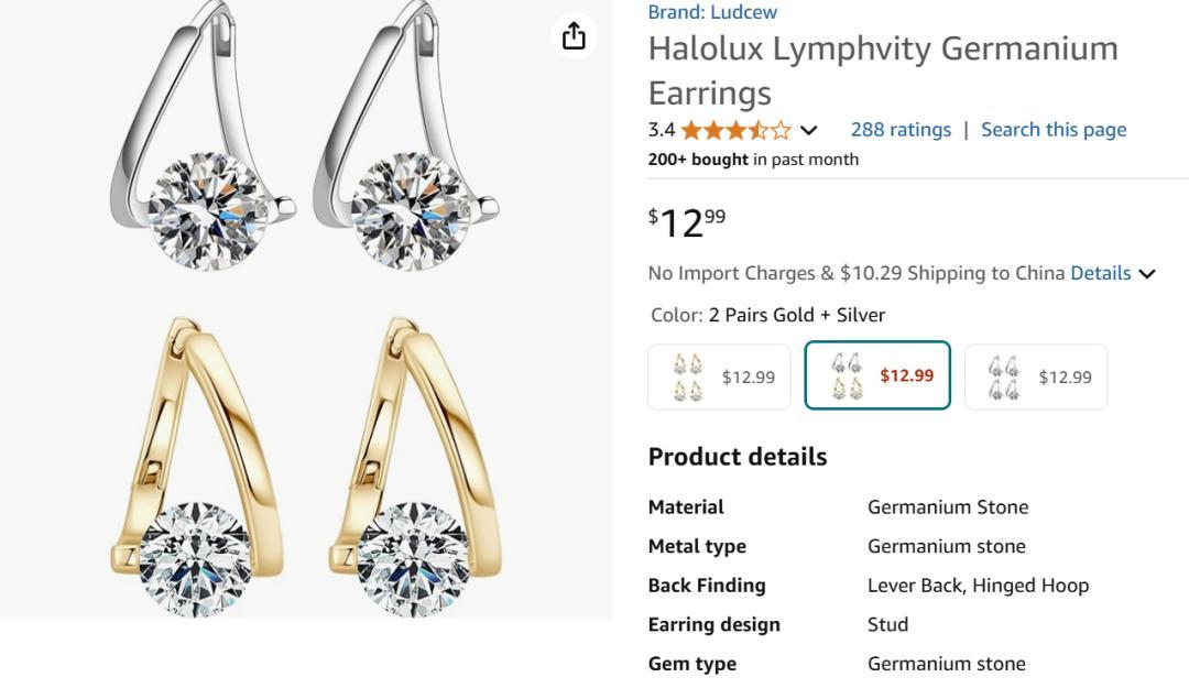 比如画风非常Goop的“锗耳环”,亚马逊上一个月成交量好几百,看着像钻石耳环,其实通体都是锗,号称能够对人体进行“磁疗”,又是改善淋巴引流,又是增强能量水平,最终达到消除焦虑和疲劳、消肿减脂的效果。
