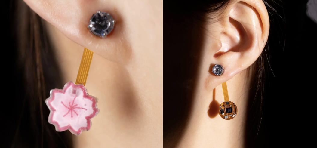 华盛顿大学的研究人员在2024年2月制作出一款能监测健康指标的耳环。表面看,这就是一副稍微有点难看的普通樱花图案耳环,实际上内置蓝牙芯片、可续航28天的电池、两个温度传感器和一根天线。