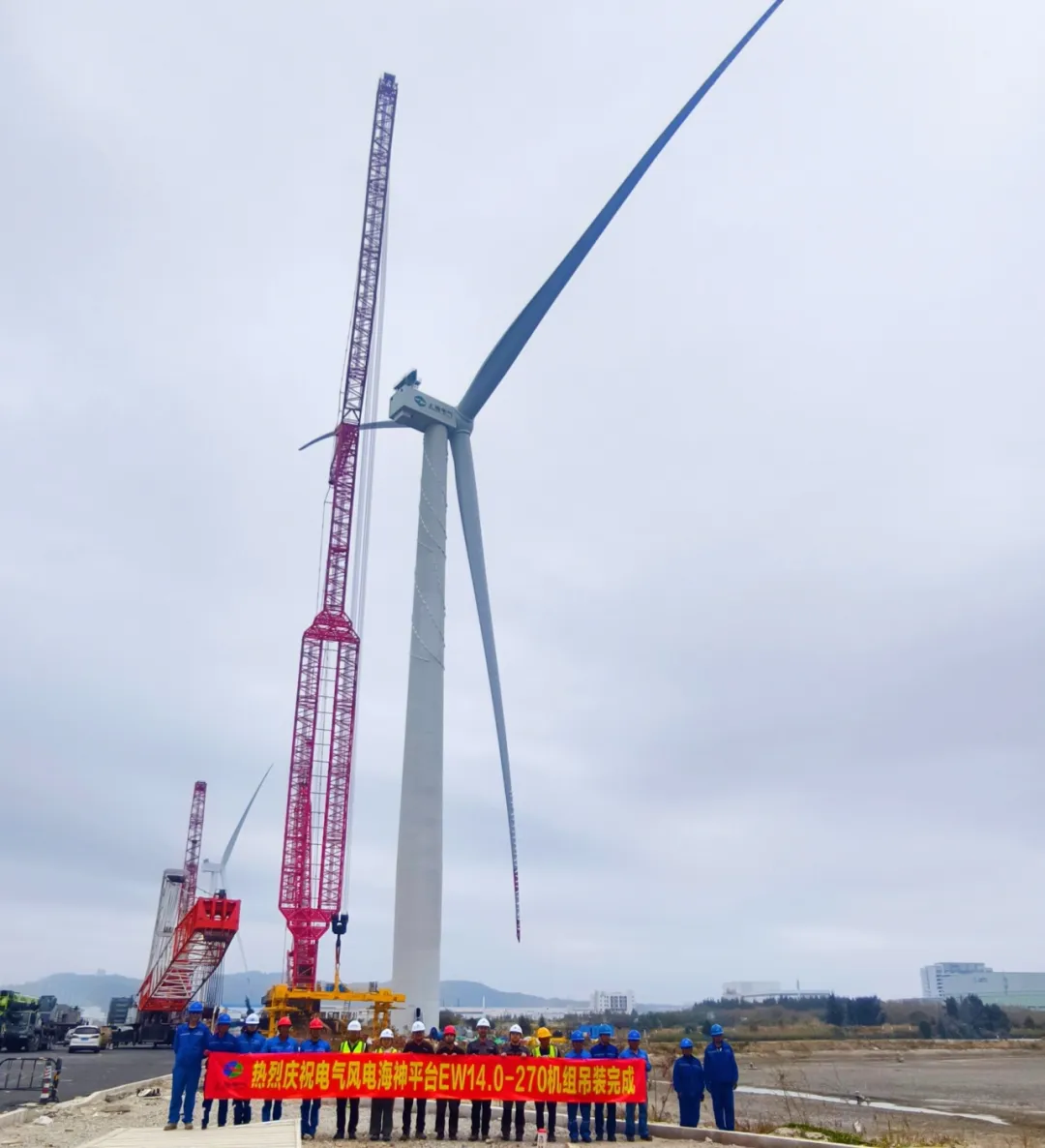 本次EW14.0-270机组吊装采用驱动链分体吊装工艺。吊装期间,电气风电各部门通力协作,克服了大型样机吊装难度高、风况变化复杂等一系列难题,保障了样机安装按计划节点完成。