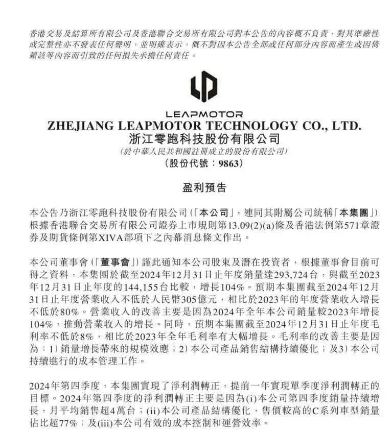 特别值得注意的是,在2024年第四季度,零跑汽车成功实现了净利润由负转正的突破,提前一年完成了单季度净利润转正的既定目标。