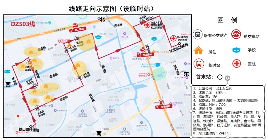 DZ503公交班线主要为杨行镇北部地区友谊苑、友谊康苑、友谊家园、宝地绿洲城、宝盘丽景苑等多个小区居民日常就医配药特别定制。班线终点链接了上海交通大学医学院附属第九人民医院和宝山区中西医结合医院两家区内三甲医院。