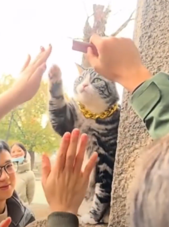 近日,江苏苏州西园寺,一只戴着大金链子、爱和游客击掌的小猫火爆网络。它前肢花纹形似“花臂”,表情淡定与游客击掌拍照,被网友戏称为“敬业猫”。有不少游客特地赶来苏州和它互动,场面好像粉丝见面会,小爪子根本忙不过来。