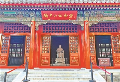 进入碧云寺山门,穿过弥勒佛殿、丹青阁,拾阶而上,便来到孙中山纪念堂前,这里原为普明妙觉殿。1925年3月12日,孙中山先生在京逝世后,灵柩移至碧云寺金刚宝座塔石券门内暂厝。1929年5月移灵南京前,在普明妙觉殿举行了隆重的悼念活动。之后这里被辟为“总理纪念堂”。1956年更名为“孙中山纪念堂”,宋庆龄亲笔书写了“孙中山纪念堂”匾额。