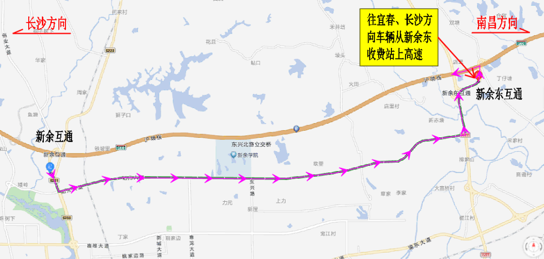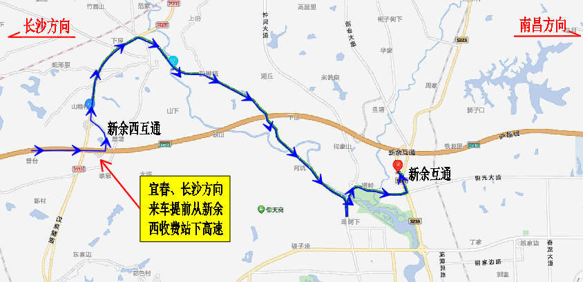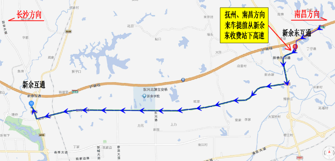 方案二:G60沪昆高速长沙方向车辆在新余西收费站提前下高速→环城路→291县道→劳动北路→钟灵大道→阳光大道→新欣北大道→新余收费站。