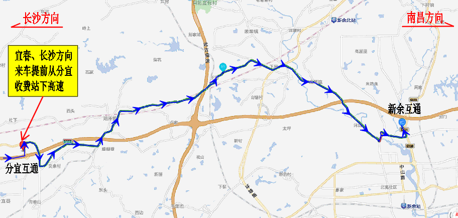 方案一:G60沪昆高速长沙方向车辆在分宜收费站提前下高速→222省道→渝钤大道→801县道→299县道→劳动北路→钟灵大道→阳光大道→新余收费站。