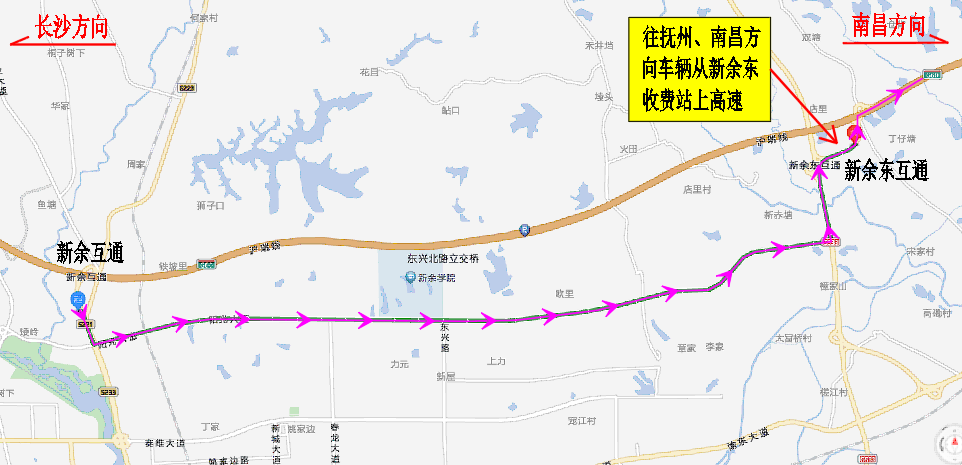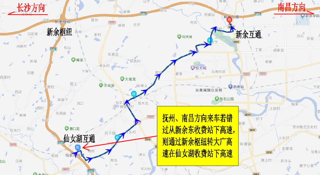 方案:车辆从新余收费站出发→阳光大道→新余东收费站上高速→G60沪昆高速南昌方向。