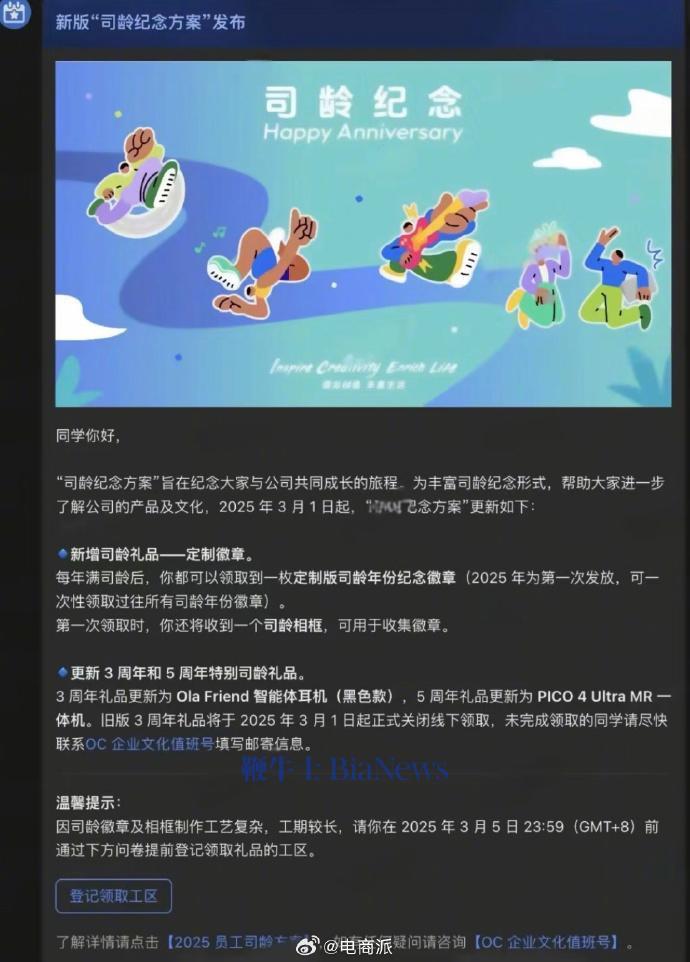 鞭牛士 3月4日消息,据电商派消息,抖音集团发布新版“司龄纪念方案”:送10年员工10天福利假,3周年的纪念戒指变成耳机。