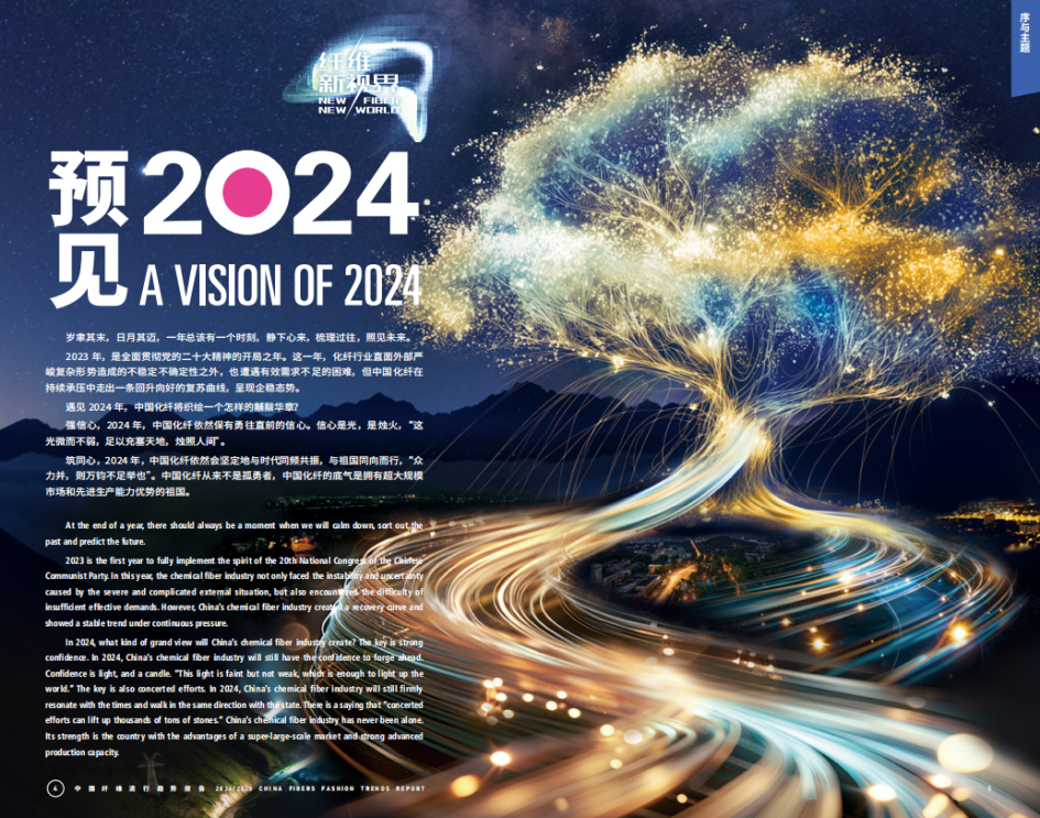 预见2024:岁聿其末,日月其迈。2023 年化纤行业直面外部严峻复杂形势造成的不稳定不确定性之外,持续承压中走出一条回升向好的复苏曲线,呈现企稳态势。遇见 2024 年,中国化纤将强信心,依然保有勇往直前的信心;筑同心,依然坚定地与时代同频共振。