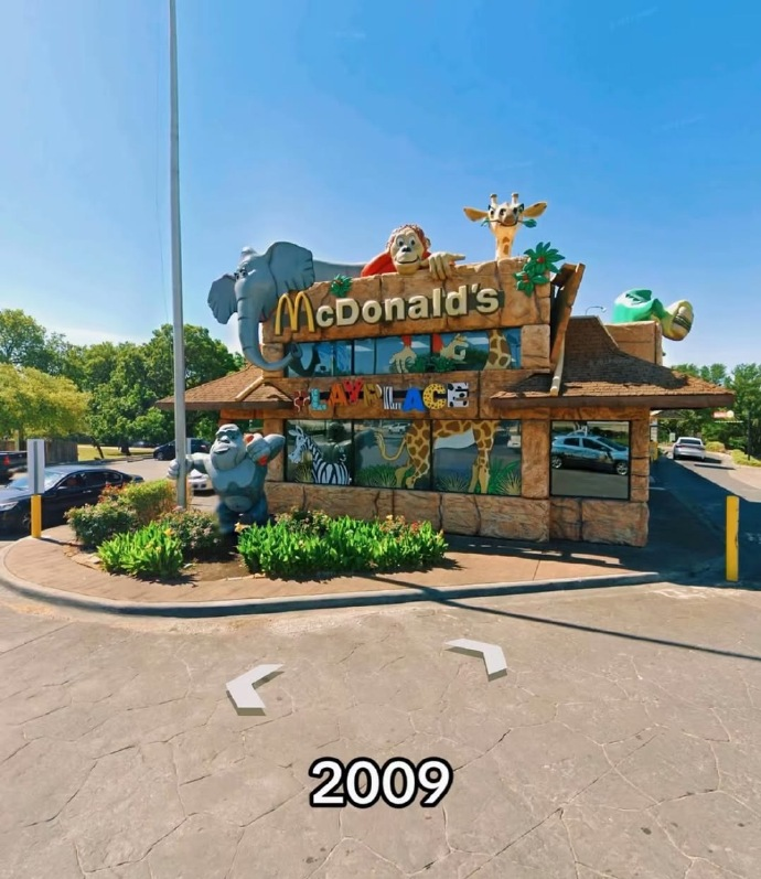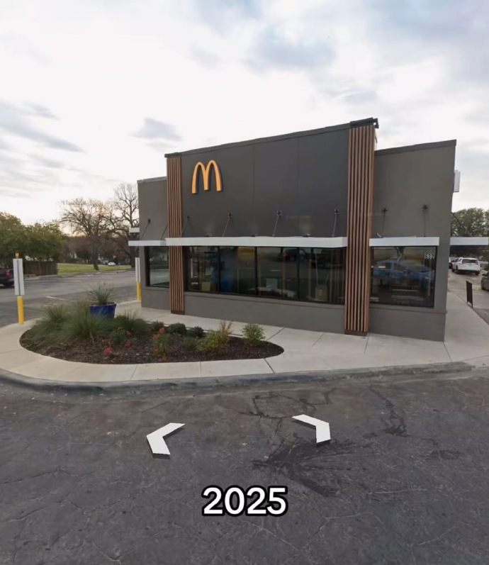 两张照片中,标注为2009年的麦当劳门店卡通元素众多,显得童趣十足;而标注为2025年的麦当劳门店则是更偏重于现代审美的高级简约风。