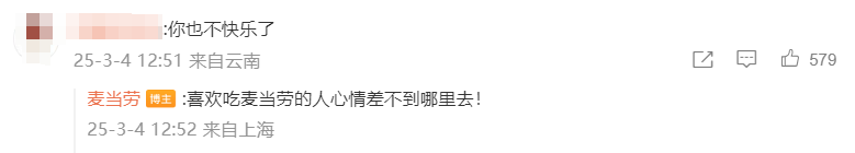 当天中午,麦当劳官方账号发文回应:“?我情绪挺好的呀”,并在评论区表示:“喜欢吃麦当劳的人心情差不到哪里去”。