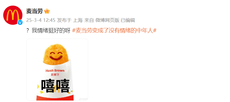 3月4日,#麦当劳变成了没有情绪的中年人#词条登上微博热搜榜。