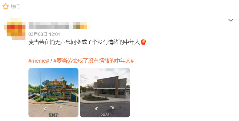 3月3日,有网友在社交平台晒出疑似同一家麦当劳门店2009年和2025年的装修风格对比图,并配文称:麦当劳在悄无声息间变成了个没有情绪的中年人。