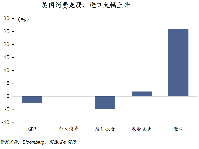 “滞胀”疑云开始笼罩美国经济!近期一系列经济数据不如人意后,亚特兰大联储的GDPNow给出的最新经济预测显示,美国第一季度GDP可能会萎缩2.5%(环比折年率)。从分项看,进口则出现了强劲的增长,然而进口增长意味着净出口的负增长,因此进口猛增成为了经济增长最大的拖累项。