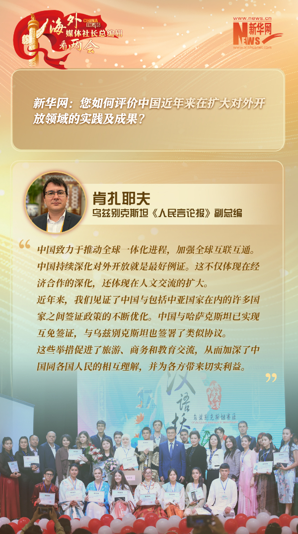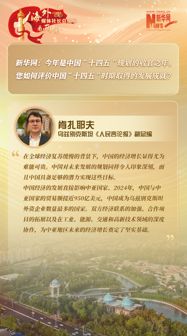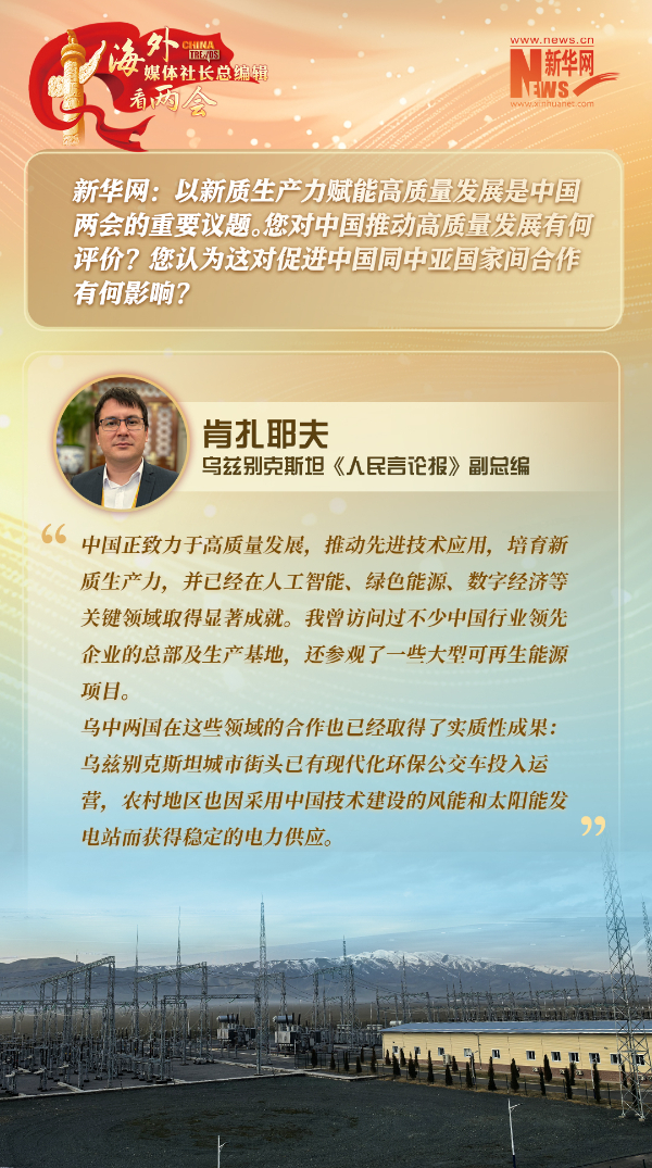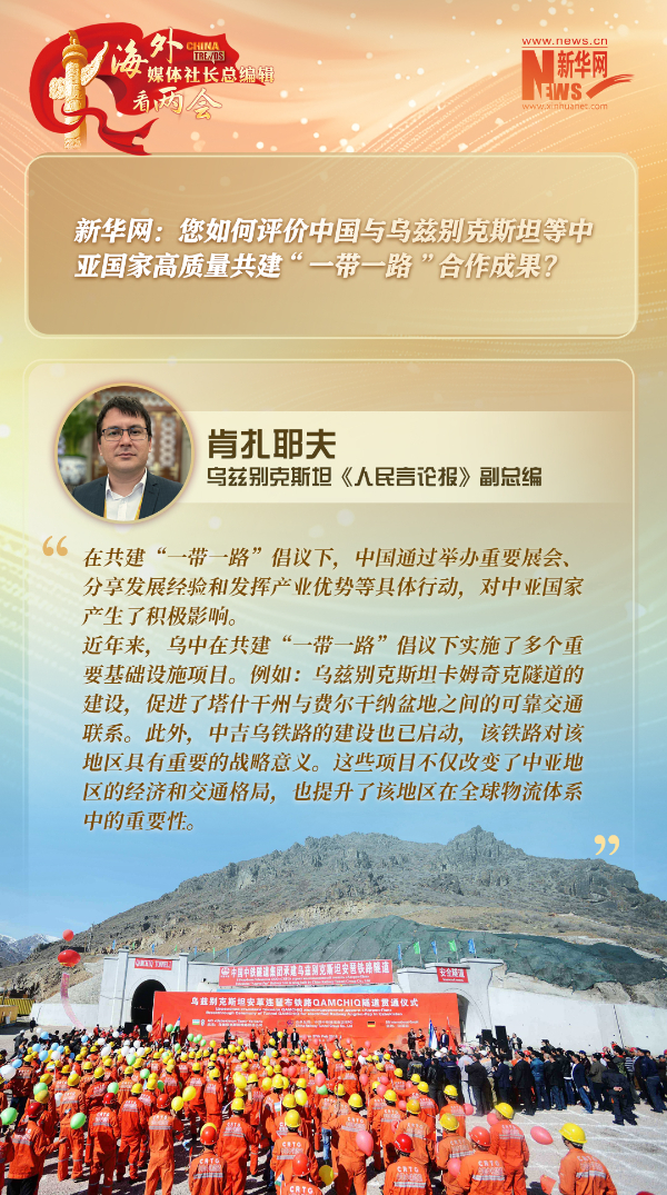 本期报道中,乌兹别克斯坦《人民言论报》副总编肯扎耶夫表示,中国的现代化之路蕴含丰富智慧,中国经济的高质量发展和开放政策更是对中亚等地区国家有重要影响。从中吉乌铁路到乌兹别克斯坦的环保公交车、风能和太阳能发电站,乌中在工业、能源、交通和高新技术领域的合作已取得显著成果。